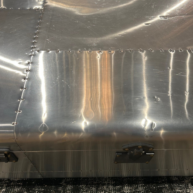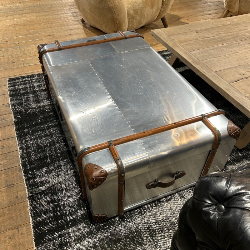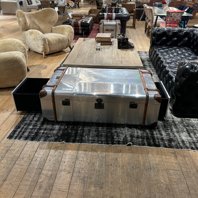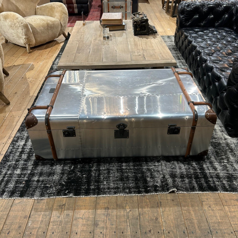 Harking back to the romantic era of long, luxurious voyages by sea, our signature Globetrekker range is inspired by an original trunk that Tim Oulton discovered at an antiques market. According to the brass plate mounted above the latch, the trunk had been presented to a Mr Tom Richards on 26 November 1914 as he set off on his journey from the UK to South Africa. The canvas of the original trunk has been updated in Timothy Oulton's Aero and Vellum finishes but authentic details from Tom Richard's trunk were preserved, including the hand-curved wood banding, vintage-style hardware, and even the name plaque. Please note this product has some minor dents on the top and sides that we have taken into account when pricing the piece.