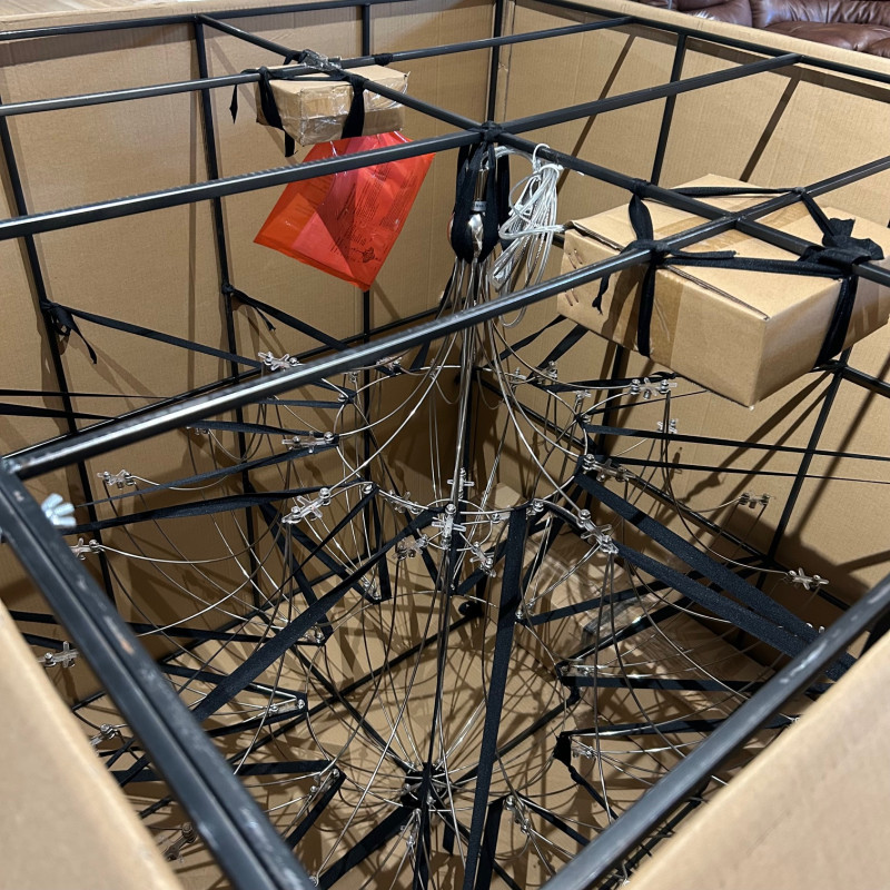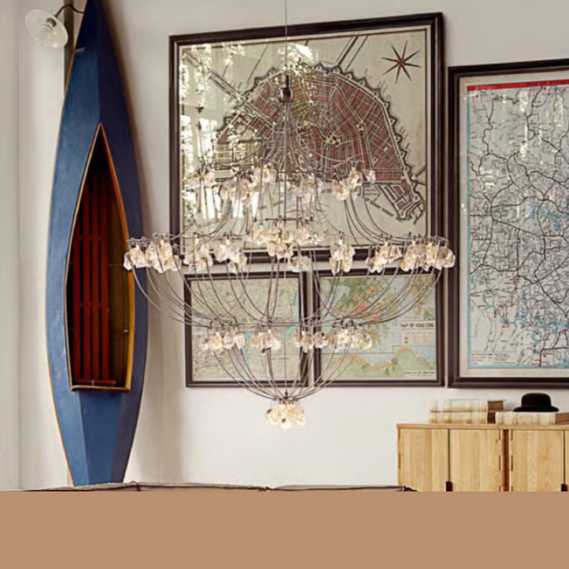 Playing with the DNA of a classic chandelier, the shape of the Classic Volt is outlined by a simple metal wire frame which is also used to transfer power to the bulbs without any need for additional wiring. This allows the chandelier to retain its drama and size whilst simultaneously being incredibly lightweight, and requiring a very low power rating. Clusters of optical glass shards are used in place of traditional candleholders, the clusters are broken and then hand-polished to a smooth finish, with the bulbs placed directly above each cluster to diffuse the light for a soft, romantic effect. A fun and avant-garde play on tradition.