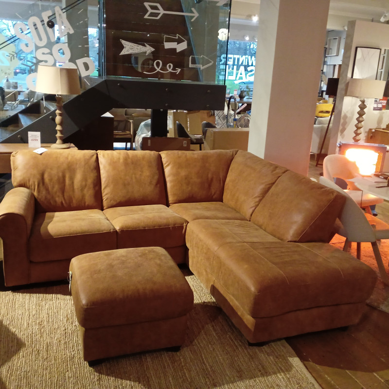 Brown leather coner sofa and footstool