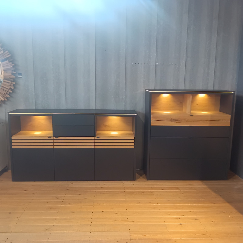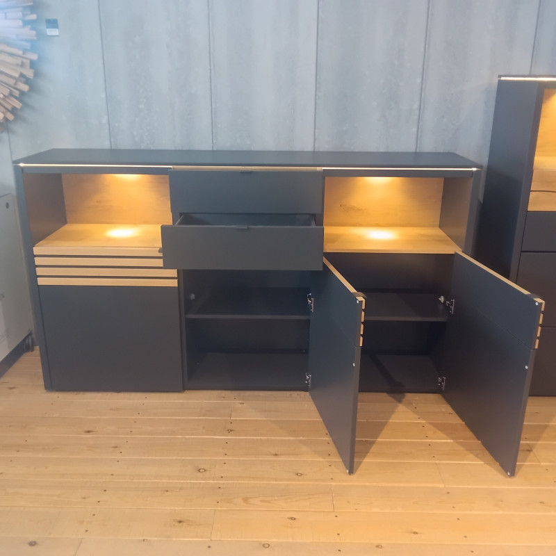 Game sideboard by Venjakob in Anthracite with Timber Oak. This sideboard has 2 central draws and 3 door compartments with 1 shelf each.